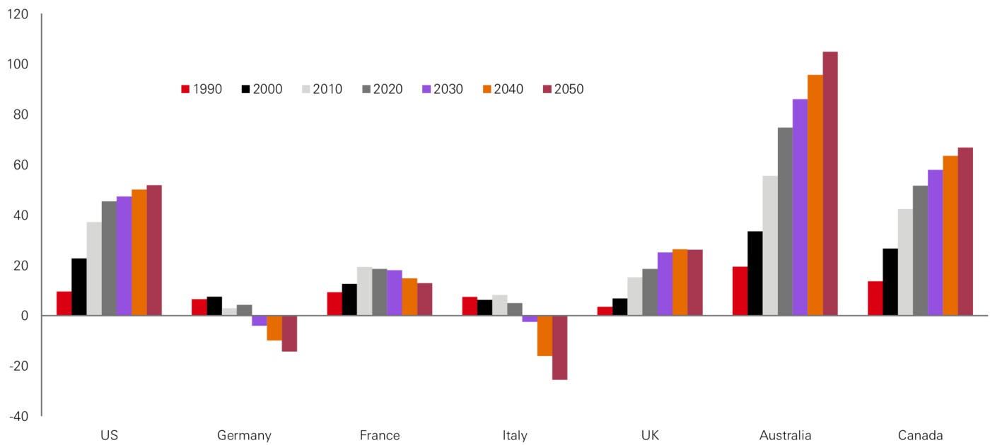 The US is not alone displaying poor fiscal dynamics – the UK, France and Italy also have high and rising debt levels. However, the US stands out because the deterioration in its public finances has occurred despite having more favourable demographics, highlighting the role of policy choices in the US. Moreover, the US’s demographic dividend is now coming to an end, adding to the pressure on the federal budget.