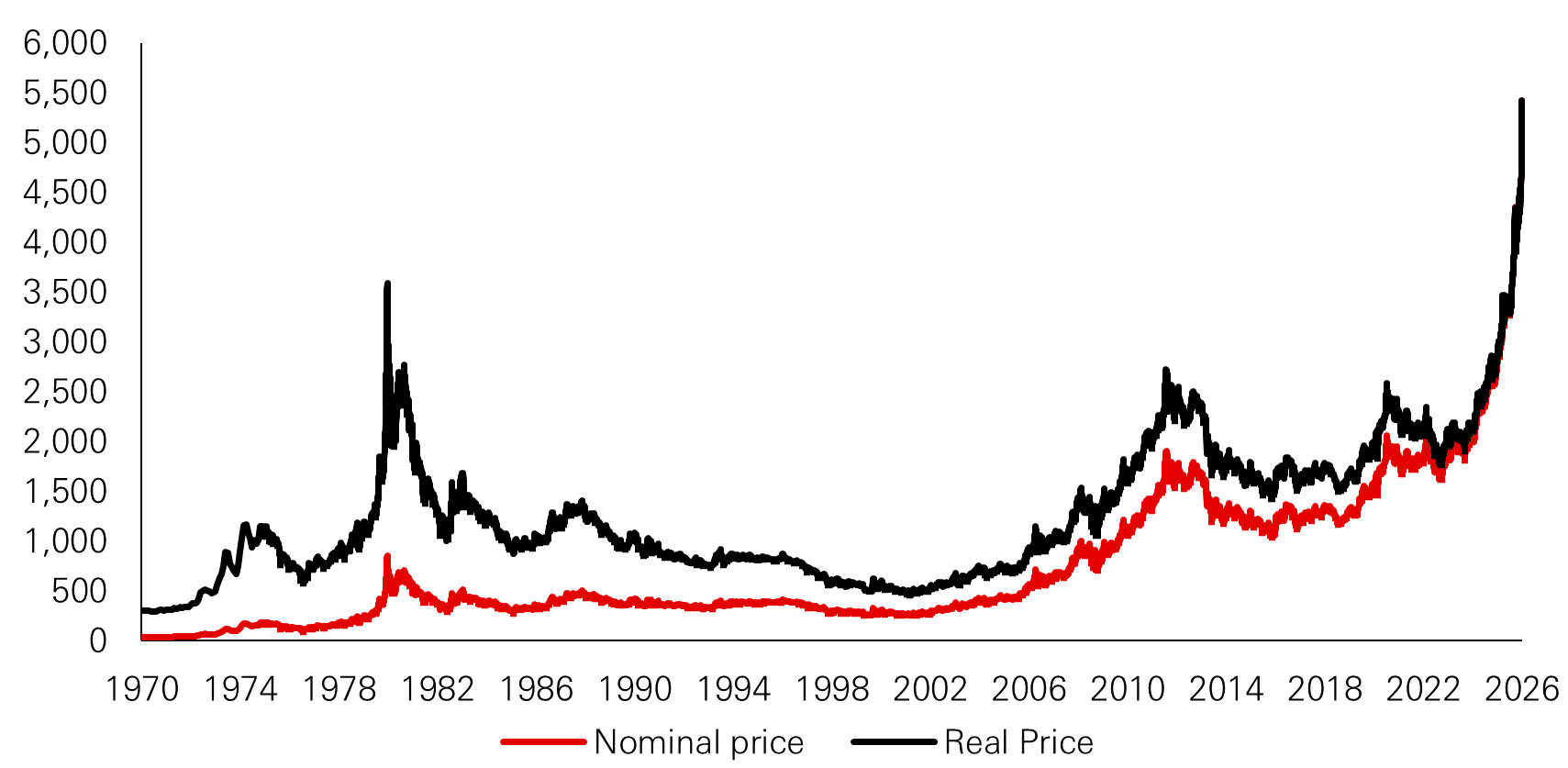 What matters in these episodes is not the nominal price level, but the macro regime in which those highs occur. Gold tends to peak cyclically only when real rates rise decisively, fiscal discipline is restored, and confidence in monetary credibility strengthens. None of those conditions are currently present. Instead, today’s environment is characterised by persistent fiscal expansion, higher equilibrium inflation volatility, and geopolitical fragmentation – features that historically coincide with prolonged gold bull markets rather than short-lived price spikes.